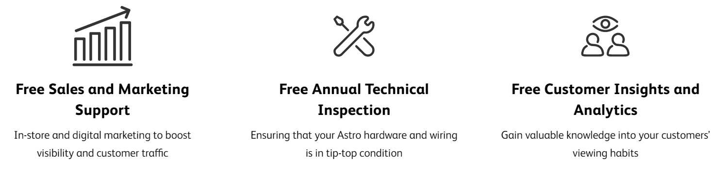 AstroBIZ takes care of your in-store entertainment so you can focus on running your business. We’ve also designed a set of sale and marketing tools to help you drive customer visits and increase revenue.